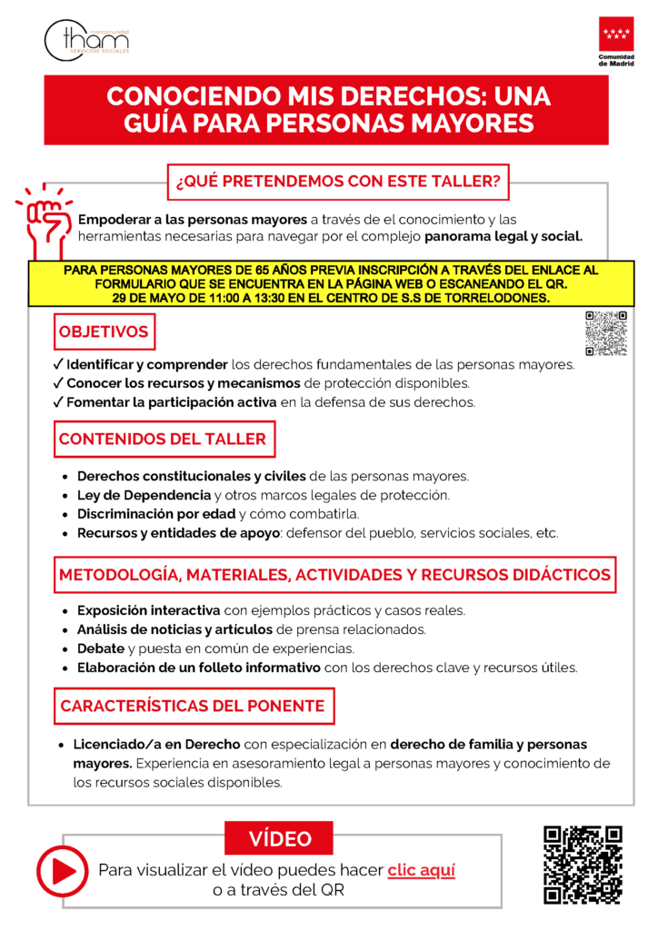 - Taller conociendo mis derechos: una guía para personas mayores tendrá lugar el próximo 29 de mayo.